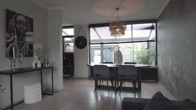 De doorzonwoonkamer is heerlijk licht dankzij de grote raampartijen aan zowel de voor- als achterzijde. De ruimte voelt ruim en aangenaam aan en is afgewerkt met een laminaatvloer en behangwandafwerking. Aan de voorzijde bevindt zich het zitgedeelte met een fraaie cinewall, terwijl aan de achterzijde ruimte is voor een royale eethoek.
