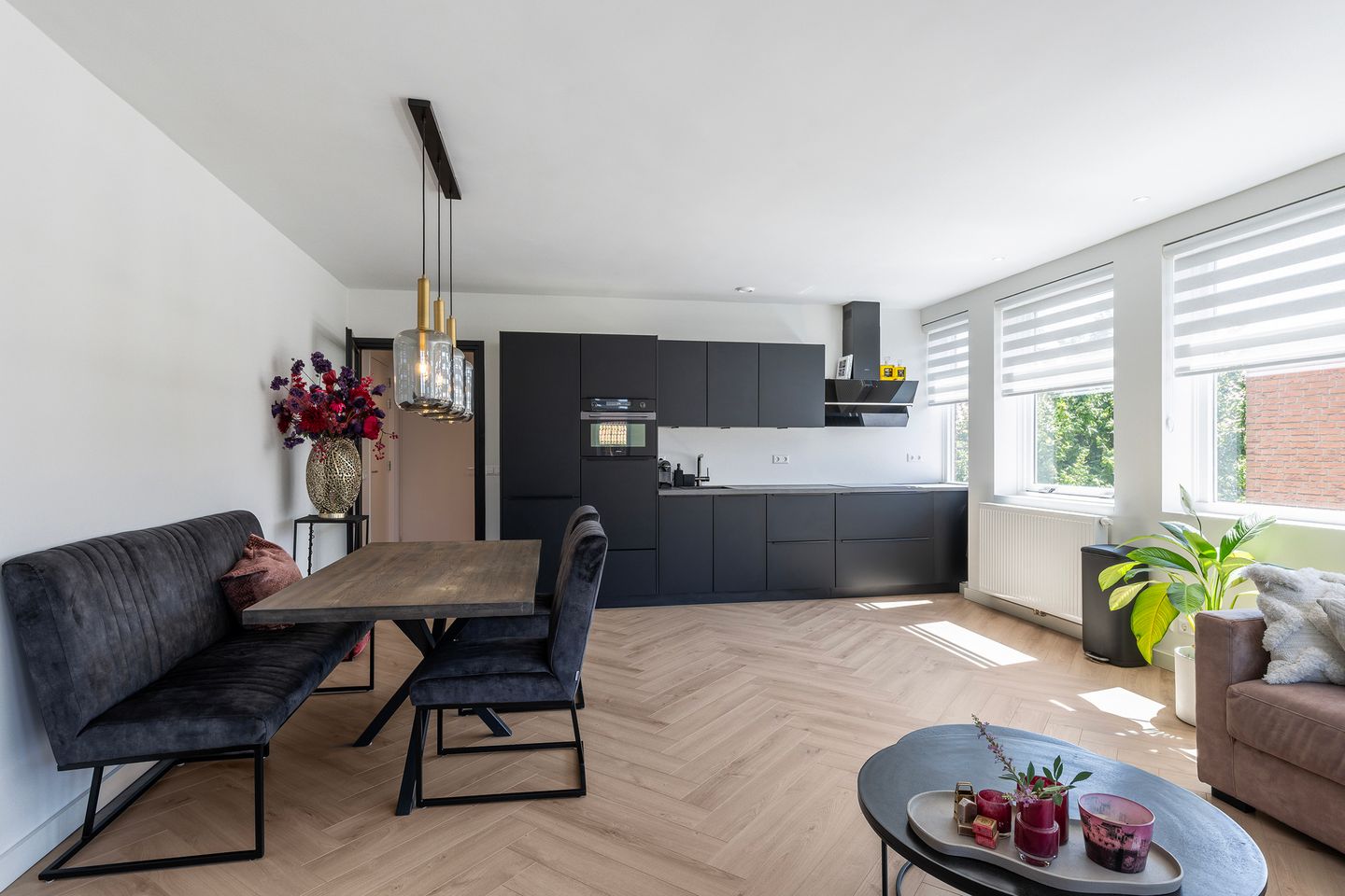 De open keuken is een echte eyecatcher, strak vormgegeven in rechte opstelling, voorzien van inductiekookplaat, combimagnetron, koelkast, vriezer, vaatwasser en afzuigkap. De matzwarte afwerking in combinatie met inbouwspots zorgen voor een luxe uitstraling.