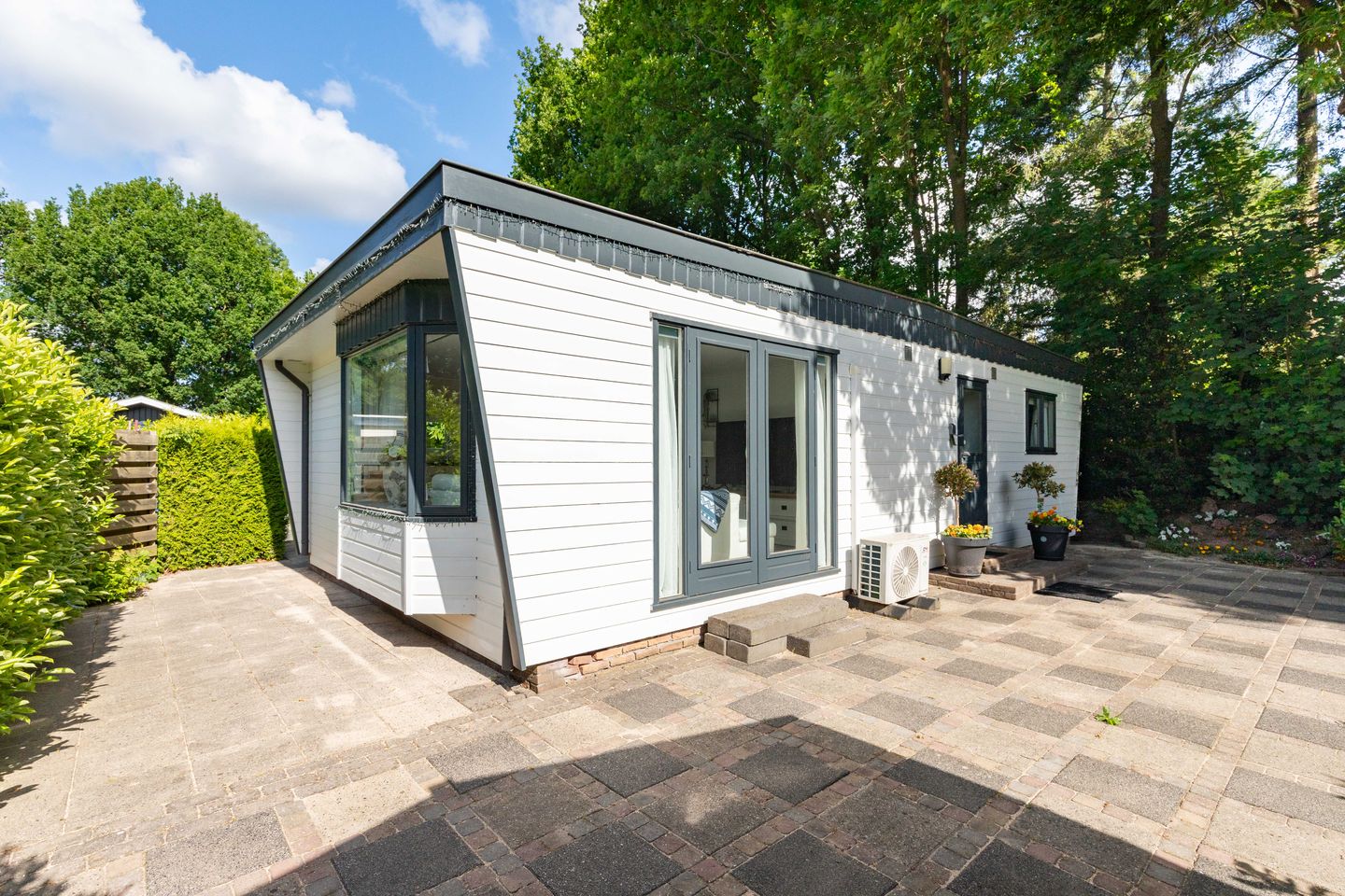 Het chalet, gebouwd in 1999, staat op een royaal perceel van circa 377 m² met een gunstige tuinligging op het zuiden. Dankzij de vrije ligging aan de rand van het park geniet u hier van extra privacy en een prachtig uitzicht op het omliggende groen. De ruime en lichte woonkamer is voorzien van een airco en schuifpui naar het zonneterras – een perfecte plek om buiten te ontspannen of gasten te ontvangen.