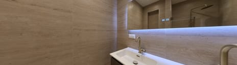 De luxe ingerichte badkamer is geheel betegeld, voorzien van vloerverwarming, een inloopdouche, dubbele wastafel en een wandspiegel met inbouwverlichting en verwarming. De mengkranen zijn uitgevoerd in mat zwarte afwerking. Het extra ruime toilet is afgewerkt met tegelwerk en glad stucwerk. Het toilet is voorzien van een hangend toilet met fonteintje met mat zwarte wastafelmengkraan.