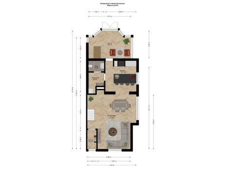 Aan de voorzijde bevindt zich de ruime woonkamer met apart zit- en eetgedeelte. De moderne afwerking met een visgraatvloer, strak stucwerk en inbouwverlichting zorgt voor een eigentijdse uitstraling. Grote raampartijen aan de voorzijde zorgen bovendien voor een fijne lichtinval.
