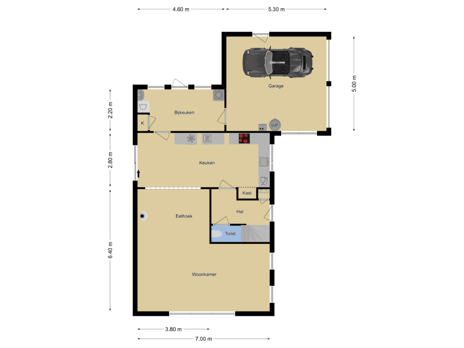 Vanuit de keuken loop je direct de bijkeuken in. In deze woning zijn geen kleine ruimtes te vinden, zo ook niet de bijkeuken. Deze is in verhouding met de overige leefruimtes waardoor het lekker ruim is opgezet. In de bijkeuken vinden we de wasmachine- en wasdrogeraansluiting. Wanneer je de was buiten wil laten drogen, dan loop je middels de tuindeur zo de tuin in. Ook is er een gootsteen aanwezig. Vanuit de bijkeuken loop je rechtstreeks de dubbele garage in.