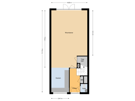 Via de entree kom je in de hal met meterkast, toilet en doorgang naar de grote lichtvriendelijke woonkamer van ca. 37.6 m2.