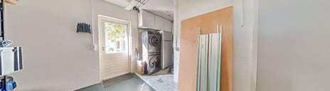 Ruime entree met garderobe, meterkast (12 groepen, krachtstroom en dubbele kookgroep) en een modern toilet met Italiaans sanitair, wastafel en volledig betegelde afwerking. De trapopgang is uitgevoerd in hout (zwart geverfd) en er is inpandig toegang tot de garage. De garage beschikt over een garagedeur aan de voorzijde en een loopdeur naar de achtertuin, aansluitingen voor wasapparatuur, verwarming, water, elektra, tegelvloer en een praktische gootsteen.
