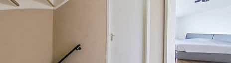 Overdekte entree, garderoberuimte met nieuw afgewerkte vaste kasten. De eerste kast is de schoenenkast, met de verdeler voor de vloerverwarming zit. Daarnaast zit de meterkast (12 groepen, kookgroep, 3 aardlekschakelaars).