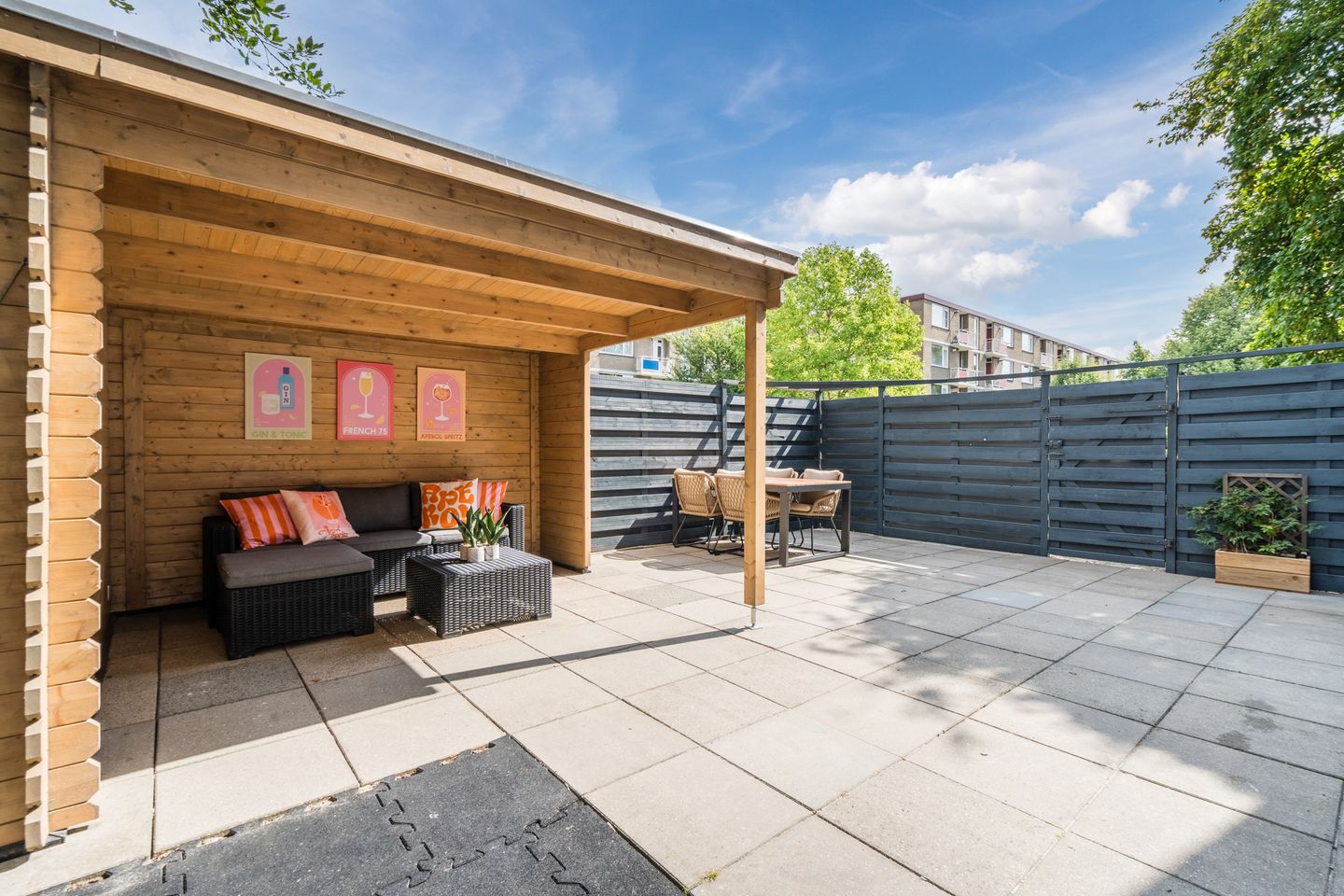 Ook de tuin is voorzien van bestrating en in 2024 is er een mooie berging geplaatst met daaraan een sfeervolle overkapping, waar u heerlijk kunt genieten.