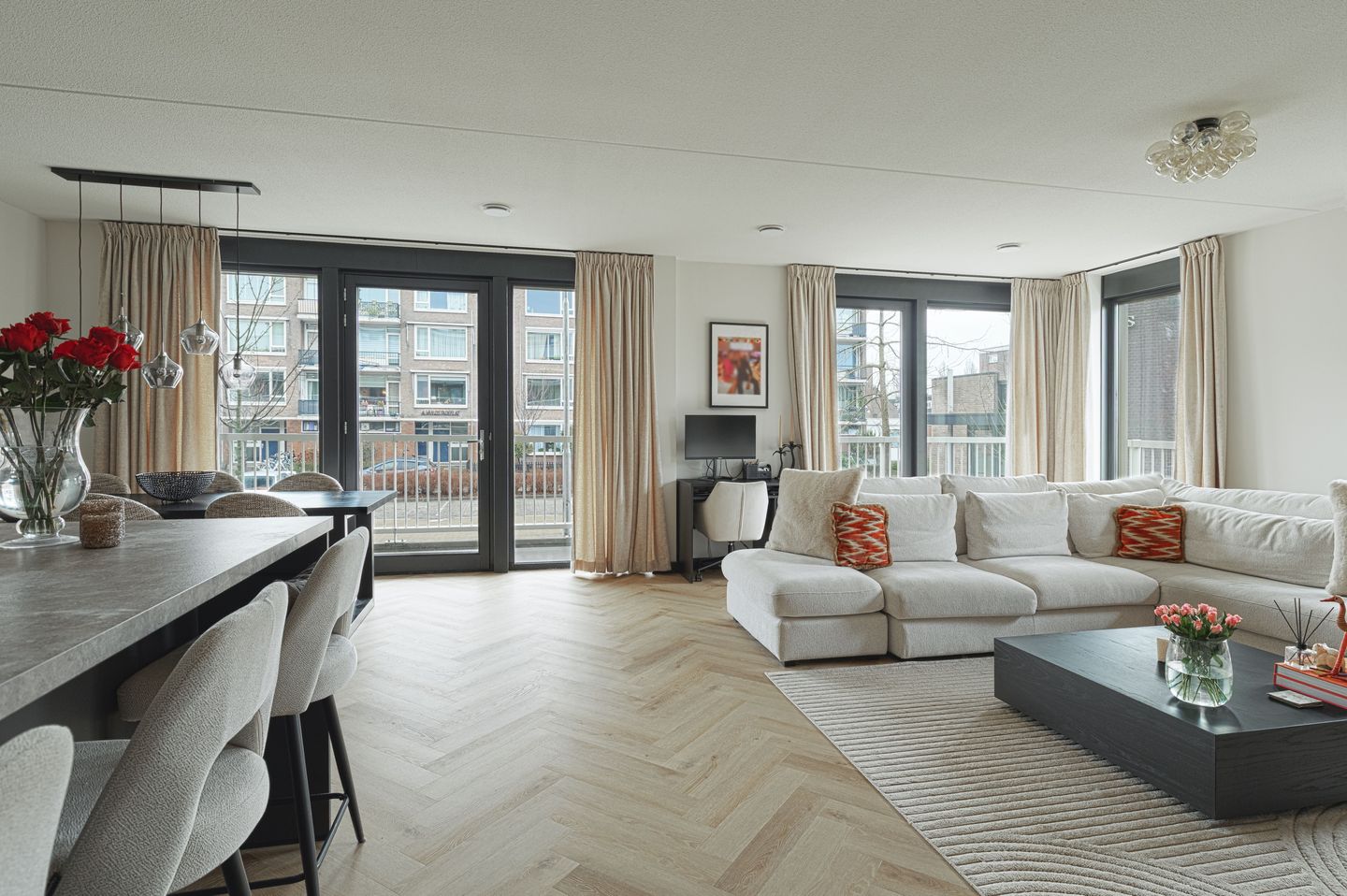 De woonkamer is een echte eyecatcher dankzij de hoekligging en de grote raampartijen, die zorgen voor een zee aan licht en een mooi uitzicht. Er is meer dan genoeg ruimte voor een gezellige zithoek en een ruime eettafel. De visgraatvloer en de strakke, neutrale afwerking geven de ruimte een moderne uitstraling. Vanuit de woonkamer stap je zo het balkon op, waardoor binnen en buiten op een fijne manier in elkaar overlopen.