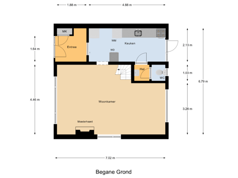 Entree, hal met meterkast en toegang tot de doorzon-woonkamer met een zijraam en zicht op de voor- en vrijgelegen achtertuin. Trap vanuit de woonkamer naar de 1e verdieping. Vanuit de hal bereikt u de dichte keuken met eenvoudig opstelling, deur naar de tuin en toegang tot een toiletruimte.
