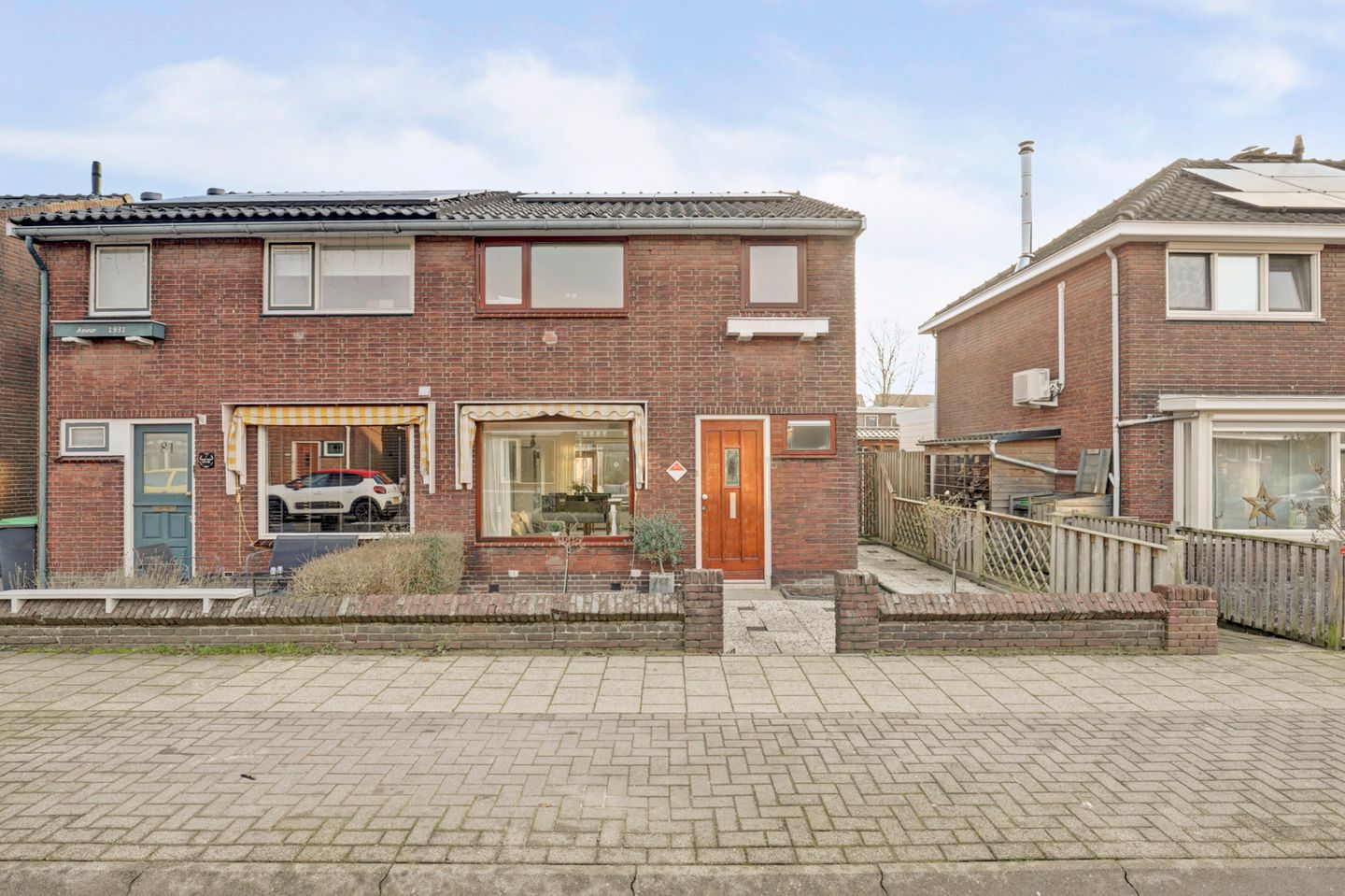 Bij aankomst valt direct de verzorgde voortuin op, die is betegeld en speels is ingericht met twee kleine boompjes. Via de zijtuin is er toegang tot de achtertuin, wat zorgt voor een praktische en prettige routing rondom de woning. Aan de voorzijde van de woning is zonwering aanwezig in een geel-wit gestreepte uitvoering, geplaatst bij het woonkamerraam.