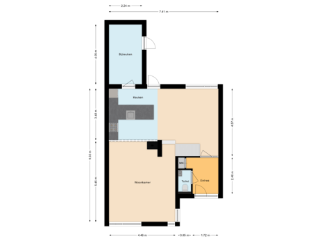 Open keuken voorzien van T-vormig keukenmeubel. De keuken is voorzien van alle gemakken zoals; 4-pits gas kookplaat, RVS-afzuigkap, vaatwasmachine, koelkast en combi-oven/magnetron. Vanuit de keuken is de praktische bijkeuken te bereiken.