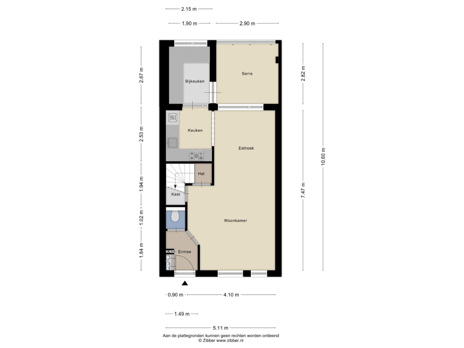 U komt binnen in de hal met tegelvloer, meterkast, garderobe en toilet. Vervolgens komt u in de woonkamer.