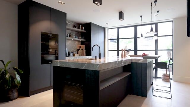 Vanuit de hal ontvouwt zich, achter een indrukwekkende taatsdeur, het kloppend hart van de woning: de woonkeuken. Een ruimte die niet ontworpen is om alleen te functioneren, maar om te leven. De woonkeuken en woonkamer zijn stijlvol van elkaar gescheiden door een taatswand met taatsdeur – een krachtig architectonisch statement waarin design en functionaliteit perfect samenkomen. Het royale kook- en spoeleiland vormt het middelpunt, met daaromheen barkrukken die uitnodigen tot lange avonden, gesprekken en samenzijn. Het hoogwaardige apparatuurpakket laat niets te wensen over: een inductiekookplaat met geïntegreerde afzuiging, klimaatkast, combi-stoomoven, combimagnetron, koelkast, vriezer en vaatwasser zijn volledig geïntegreerd en afgewerkt op topniveau, terwijl de Quooker-kraan het geheel compleet maakt. De ruimte is zó royaal opgezet dat naast het eiland moeiteloos een grote eethoek past én er extra werkruimte is gecreëerd. Openslaande deuren verbinden de woonkeuken direct met de achtertuin, waardoor binnen en buiten naadloos in elkaar overlopen.