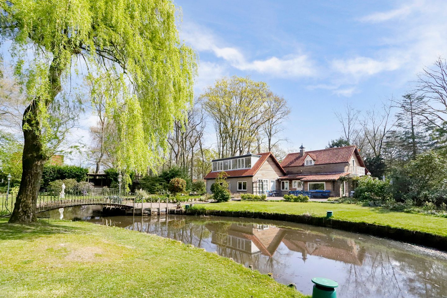 De buitenruimte is werkelijk uniek. Het perceel is begroeid en voorzien van een grote vijver met bruggetje, gazon, bomen, bloemperken en diverse zitplekjes – overal vind je rust en natuur.