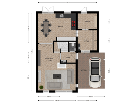 Het is een nette, verzorgde omgeving met veel jonge gezinnen en een gemoedelijke sfeer. Voor de woning ligt een brede oprit met ruimte voor meerdere auto’s. Hier staat ook een royale Douglas carport die uw auto beschut en onderdak biedt. De voortuin is verzorgd aangelegd en sluit mooi aan bij het totaalbeeld van de straat.
