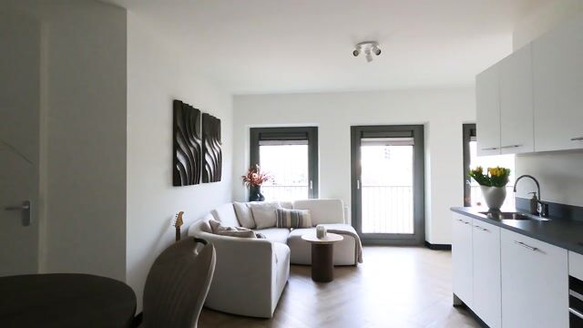 De lichte woonkamer is strak afgewerkt en beschikt over grote raampartijen die zorgen voor veel daglicht en een ruimtelijk gevoel. De open keuken heeft een moderne uitstraling en is uitgerust met diverse inbouwapparatuur, waaronder een koelkast, Siemens combi-oven, inductiekookplaat en vaatwasser.