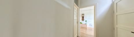 Met de portiektrap komt u op de tweede etage bij de entree van het appartement. Bij binnenkomst valt het ruimtelijke gevoel direct op, dankzij de hoge plafonds (ca. 2.90 m hoog). De hal geeft toegang tot alle andere vertrekken. In de hal bevindt zich ook de meterkast (6 groepen met ALS).