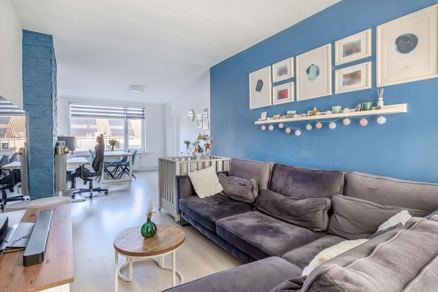 De woonkamer is direct een verrassing: een ruime doorzonkamer met aan de achterzijde een gezellige zithoek en aan de voorzijde een royale eethoek en werkplek. Dankzij het grote raam aan de voorzijde en de glazen deur naar het vergrootte balkon aan de achterzijde valt het daglicht de hele dag mooi binnen, een heerlijk lichte en sfeervolle leefruimte. De kamer heeft een neutrale afwerking met lichte vloeren en strak geschilderde wanden, waardoor iedere woonstijl hier moeiteloos past.