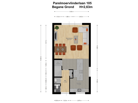 De moderne keuken ca. 3.50 x 2.97 is een echte blikvanger, strak vormgegeven met een ruim kookeiland, greeploze kasten en een stijlvol werkblad in betonlook. De keuken is uitgerust met moderne inbouwapparatuur, waaronder een inductiekookplaat met geïntegreerde afzuiging, combi-oven, oven, wijnklimaatkoelkast en grote inbouw koelkast. Dankzij de grote raampartijen aan de voor- en zijkant valt er volop daglicht binnen, wat samen met de designverlichting en donkere accenten zorgt voor een lichte, luxe en hedendaagse uitstraling.