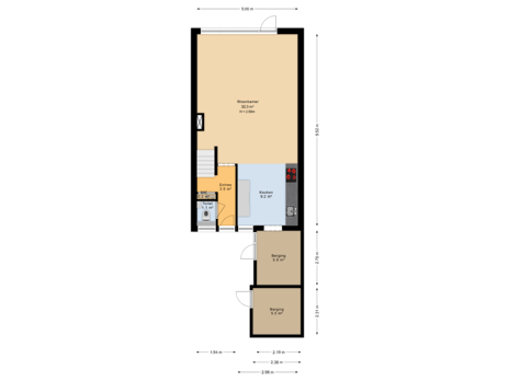 Begane grond: ruime hal/entree, nieuw toilet, woonkamer met open keuken (samen ca. 41 m²), bijkeuken met achteringang en een berging.