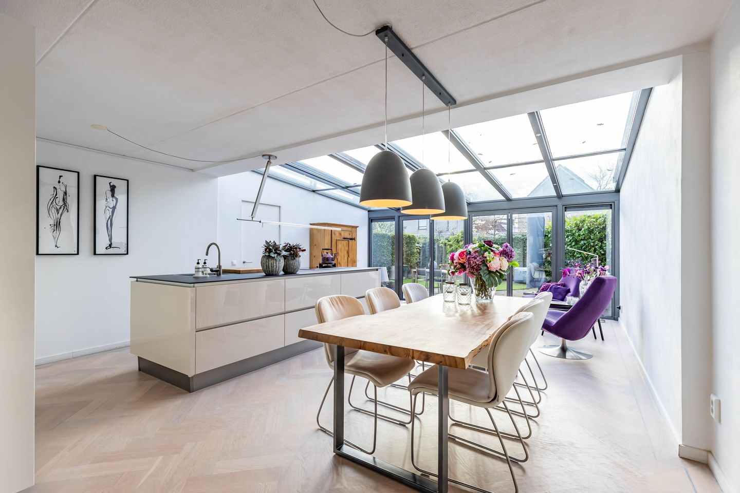 Het glazen dak van de aluminium uitbouw (Solarlux) heeft een automatisch zonnescherm.