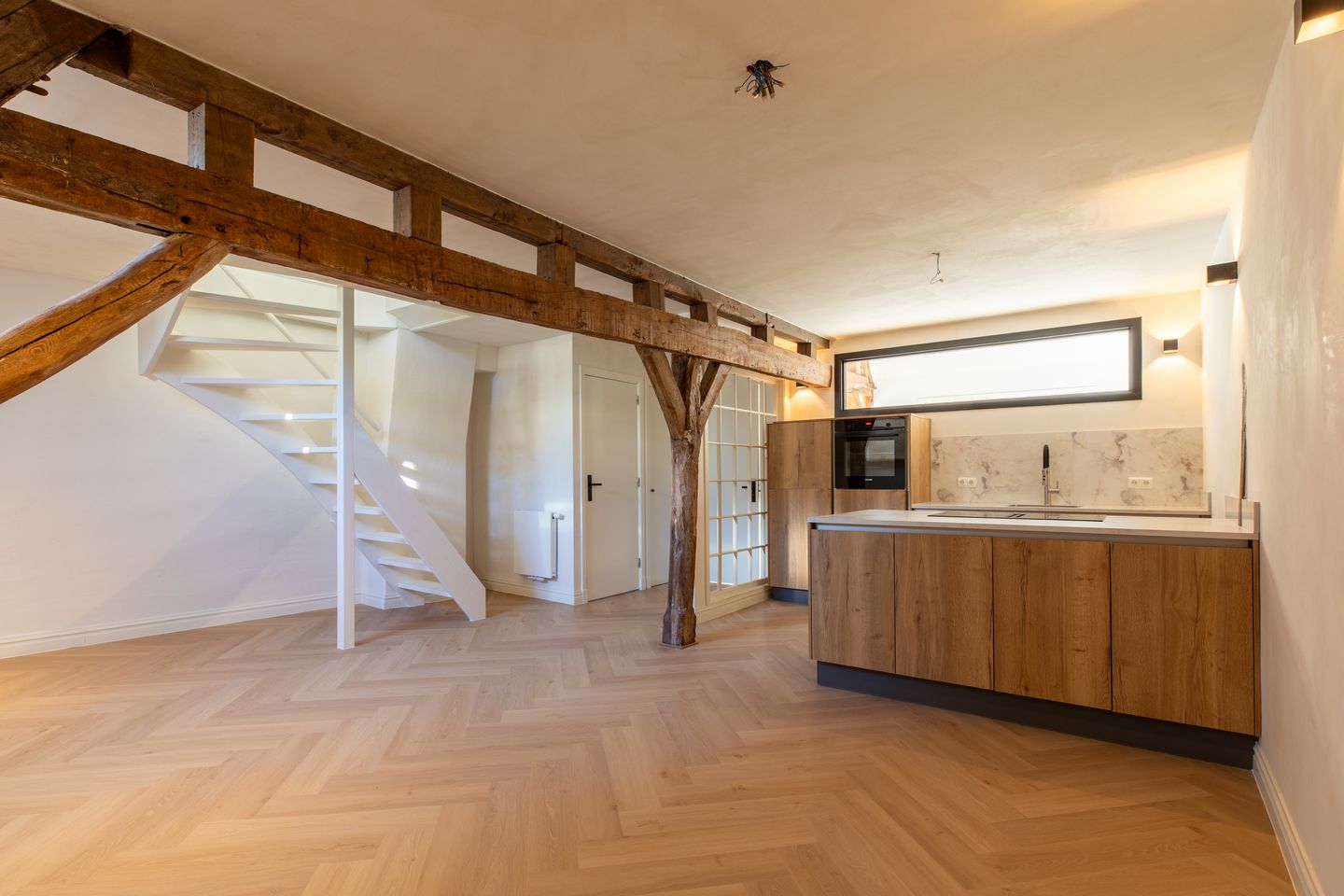 Hier stap je een instapklaar appartement binnen. Denk aan een moderne PVC-visgraatvloer, "exposed brick walls", authentieke eikenhouten balken en strak gestucte wanden – een geslaagde mix van oud en nieuw. De ligging op de bovenste verdiepingen garandeert rust – je hebt hier geen bovenburen. De slaapkamers en badkamer liggen op de bovenste verdieping, onder de indrukwekkende nok van bijna 4,50 meter hoog. Dat geeft niet alleen een bijzonder ruimtelijk gevoel, maar biedt ook volop mogelijkheden om de ruimtes sfeervol en persoonlijk in te richten. Alles is tot in de puntjes verzorgd, zodat jij alleen nog maar je meubels hoeft neer te zetten.