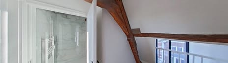 Een groot pluspunt is de aanwezigheid van een lift tot de eerste verdieping. Ideaal voor wie gemak zoekt of slecht ter been is. Voor wie liever de trap neemt, is er ook de originele houten bordestrap die via het torentje naar de maisonettes op de bovenverdiepingen leidt.