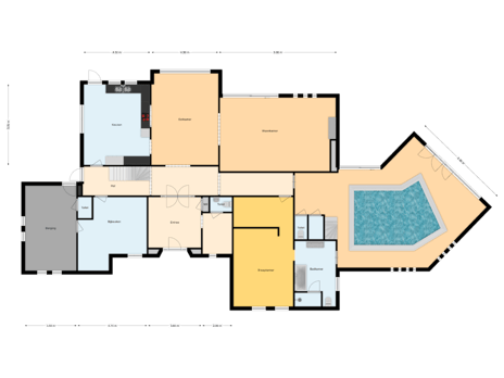 Entree, hal voorzien van garderobe en toilet. Verder is er een slaapkamer met kleedruimte en badkamer ensuite, binnenzwembad met douche en toilet en trap naar de eerste verdieping aanwezig. Vanuit de hal aan de linkerzijde van de woning is de werkkeuken, berging voorzien van toilet, trap naar de eerste verdieping en woonkeuken bereikbaar. Vanuit de woonkeuken, maar ook vanuit de gang is de eetkamer bereikbaar. De eetkamer verleent toegang tot de zitkamer