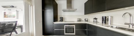 De tijdloze, open keuken (2013) is uitgevoerd in een L- vormige opstelling en is voorzien van alle benodigde inbouwapparatuur.