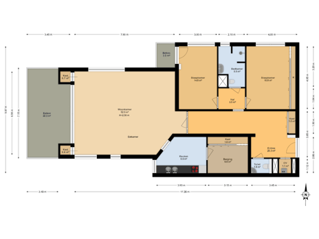U betreedt de woning via een ruime hal, voorzien van een uitgekiend verlichtingsplan waardoor boeken en schilderijen prachtig worden uitgelicht. Toilet, bergkast met ketelopstelling, woonkamer (ca. 52 m²) met twee vaste kasten en toegang tot het grote terras. Dichte keuken met inbouwapparatuur (ca. 9 m²) met aansluitend de bijkeuken (9 m²). Twee slaapkamers van respectievelijk ca. 20 en 15 m², met daartussen de badkamer voorzien van een wastafel, douchecabine en tweede toilet.