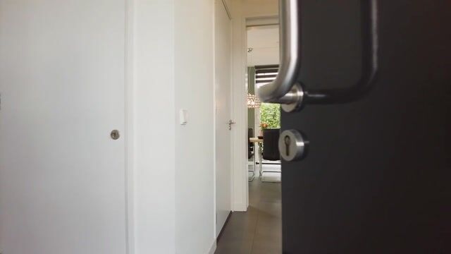 De entrée biedt toegang tot de eetkamer, keuken, werkkamer en woonkamer. Deze ruimtes zijn van de hal afgescheiden door een stijlvolle houten inbouwschuifdeur met ingelegd glas, die zorgt voor een fraaie lichtinval en een ruimtelijk gevoel.