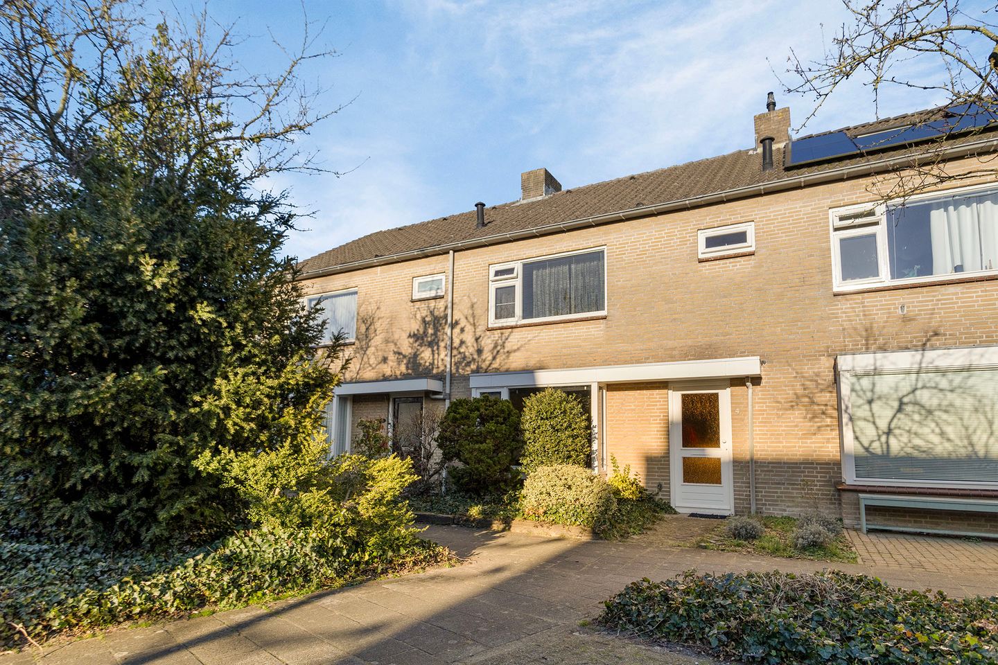 De voortuin is groen aangelegd en voorzien van beplanting, wat zorgt voor een prettige uitstraling en extra privacy.