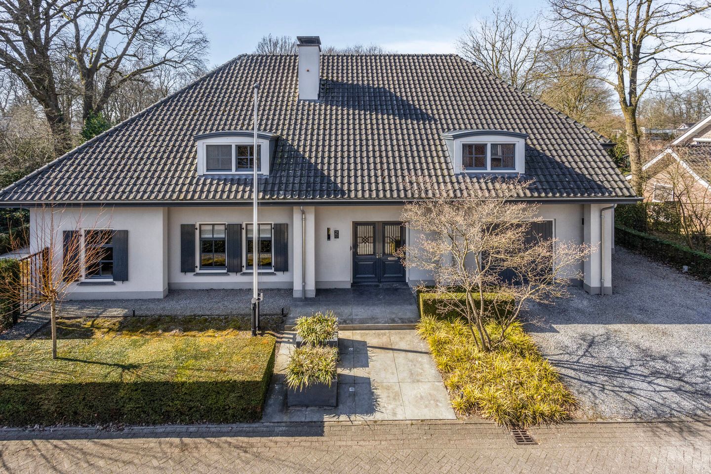 Praktisch gemak is hier net zo belangrijk als esthetiek. De tuin is voorzien van een regelbare beregeningsinstallatie, zodat het groen altijd in topconditie blijft. Aan de voorzijde van de woning is een ruime oprit met plaats voor twee auto’s, inclusief een laadpaal voor elektrisch rijden.