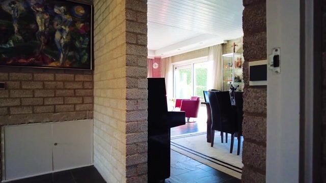 Vanuit de hal kom je in de ruime L-vormige woonkamer die is voorzien van een grote zithoek en een riante eethoek. Terwijl je naar je favoriete film of serie kijkt, geniet je volop van het vlammenspel in de brede openhaard die aan de zithoek is gelegen. De woonkamer is voorzien van drie glazenschuifpuien, die zorgen voor een mooie zichtlijn naar de zij- en achtertuin. Vanuit hier loop je zo het riante terras op. De woonkamer is naast de fraaie haardpartij tevens voorzien van een vaste (boeken)kast.