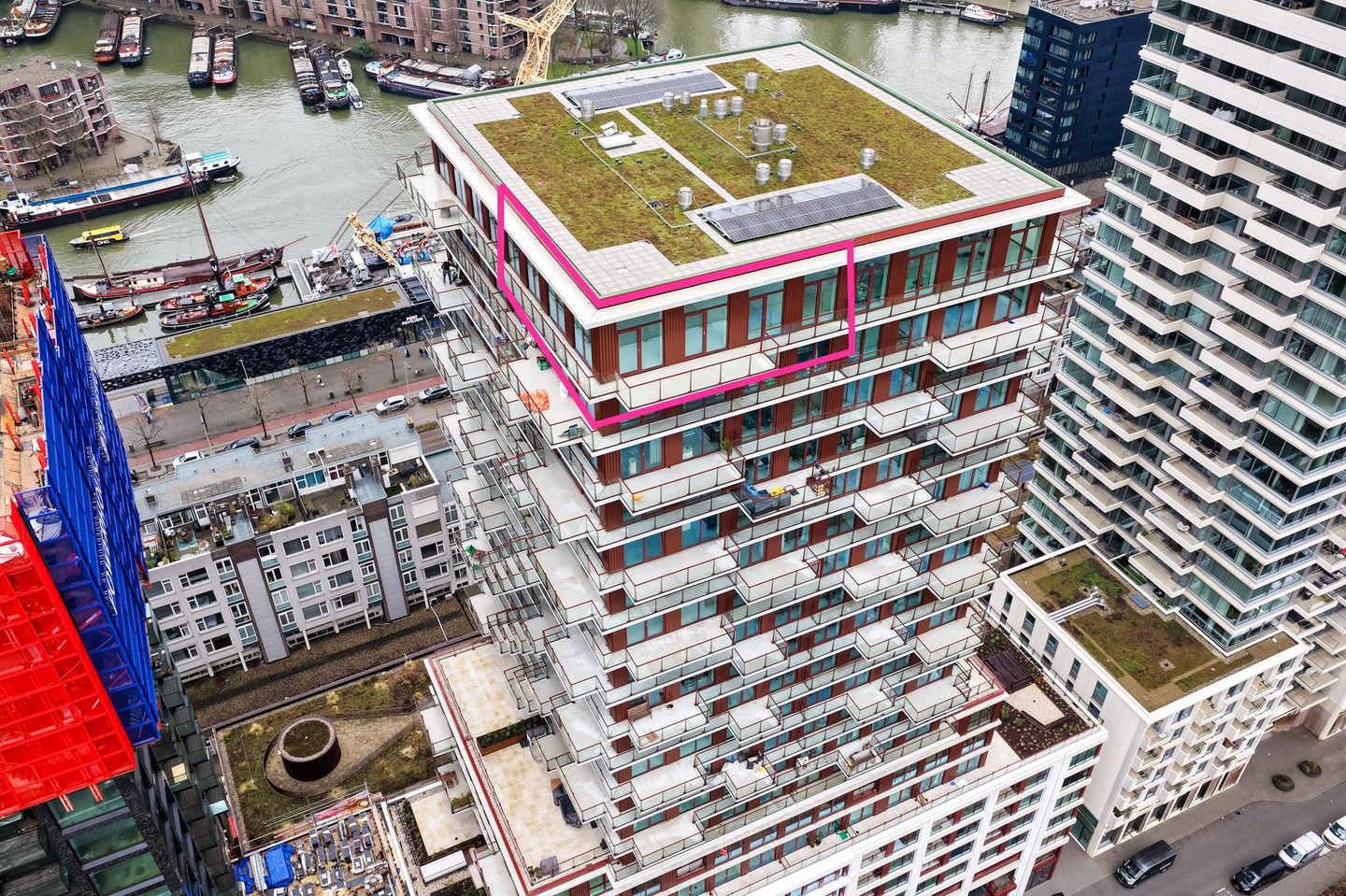 Rondom de woning ligt een royaal omlopend terras van circa 34,3 m². Dankzij de ligging op penthouseniveau geniet je hier van optimale privacy, zon op verschillende momenten van de dag en een spectaculair panorama over de skyline en binnenstad. Overdag zie je de stad bruisen, ’s avonds verandert het uitzicht in een indrukwekkend lichtdecor.