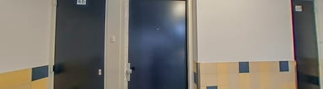Afgesloten entree met brievenbussen en het bellentableau, het trappenhuis en de bergingen.