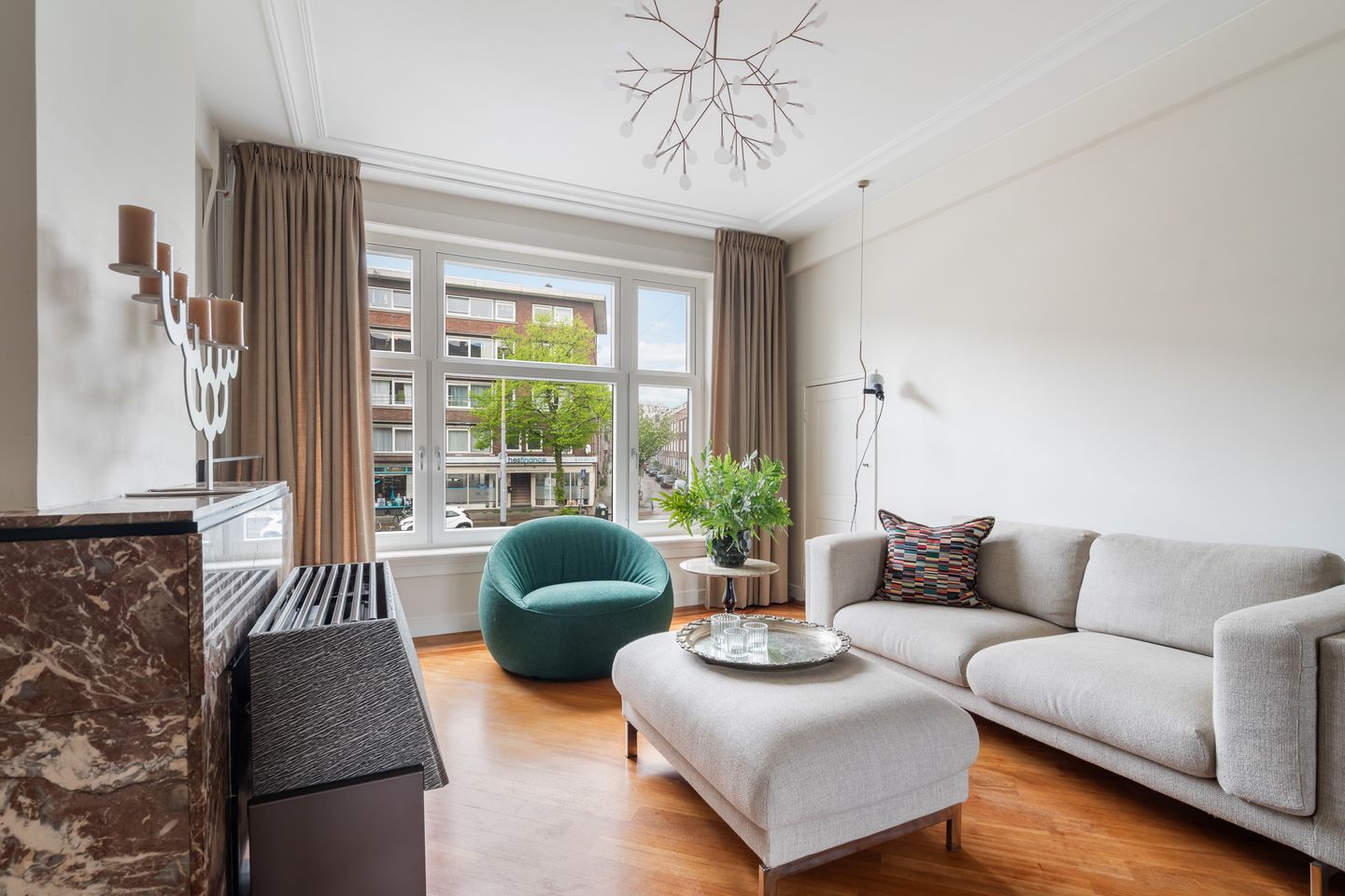 Ruime hal/entree met twee vaste kasten en toegang tot alle vertrekken. De ruime woonkamer met en suite inbouwkasten is gelegen aan de voorzijde van het appartement. Direct wordt je overspoeld met tal van prachtige originele jaren '30 details zoals o.a. de ornamenten, het glas-in-lood, paneeldeuren wat het een zeer authentieke sfeer geeft. Door de grote raampartijen aan beide zijde van de woning, treedt er veel natuurlijk licht de woning binnen, wat zorgt voor een aangename, lichte sfeer. Het eetgedeelte zit in het midden van de woning en er is voldoende ruimte voor een eettafel.