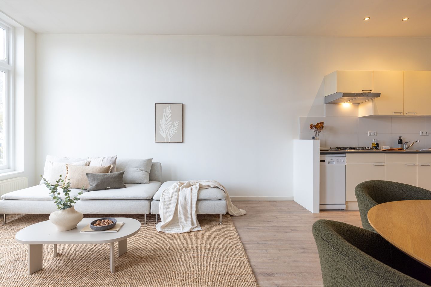 Open entree met toegang tot de verschillende vertrekken. De woonkamer is ruim en licht dankzij de grote ramen, waardoor je hier een fijne leefruimte hebt met voldoende plek voor zowel een zit- als eethoek.