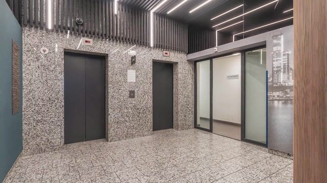 The entrance is well-maintained and secured, equipped with an intercom system and mailboxes. The complex features two elevators, ensuring comfortable and efficient access to the apartments.