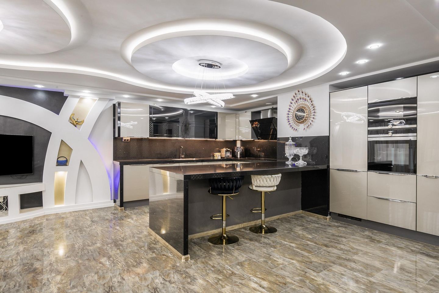 -Keuken: De open keuken is luxe en strak afgewerkt en voorzien van een royaal kookeiland. De keuken beschikt over moderne, greep loze kasten en een stijlvol werkblad. De wanden en het plafond zijn hoogwaardig afgewerkt en voorzien van geïntegreerde verlichting, wat zorgt voor een moderne en ruimtelijke uitstraling.