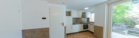Entrance to the apartment’s front door.Through the spacious living room, which accommodates both a seating and dining area, you can access the bedroom at the front of the building.The bathroom, featuring a walk-in shower, toilet, and washbasin, is accessible via the living room. Between the bathroom and the kitchen, there is a built-in cupboard with a connection for a washing machine.