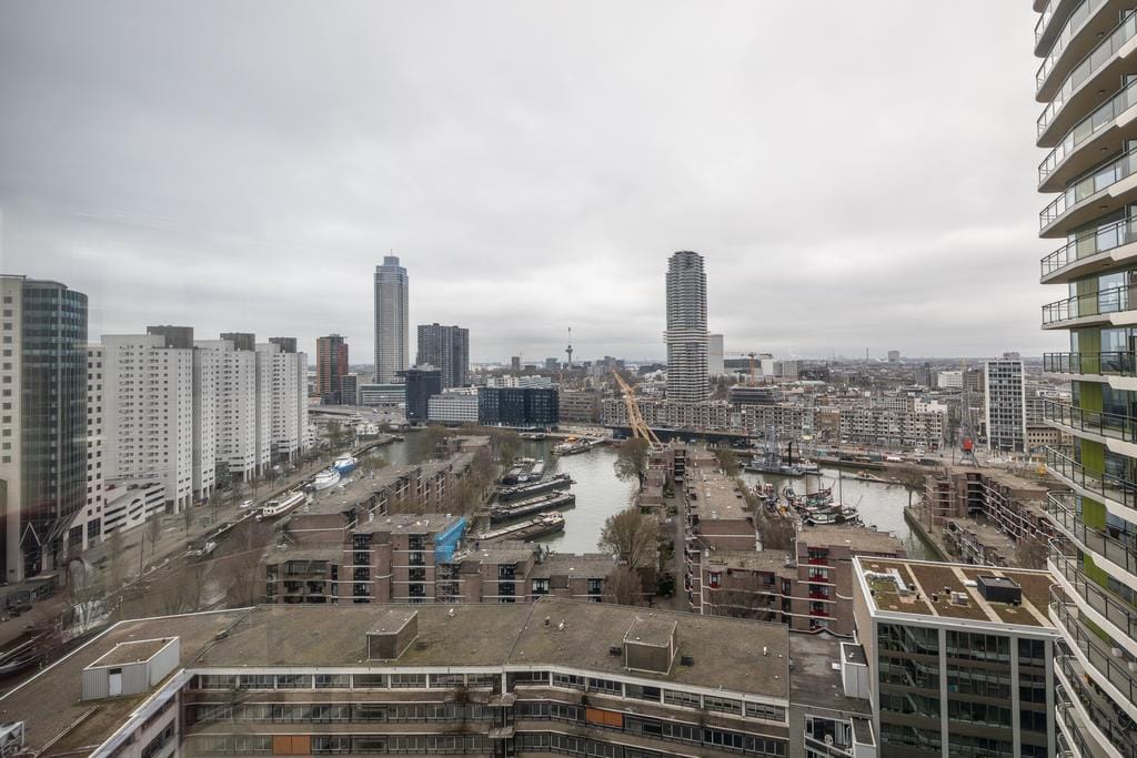 The absolute highlight of this apartment is, of course, the stunning view of various Rotterdam landmarks. The location is ideal, situated between Rotterdam’s city center and the Boompjes neighborhood. The Erasmus Bridge, various shops and restaurants, and the Markthal are all within walking distance. Blaak train station, major highways, and Rotterdam The Hague Airport are also within easy reach.