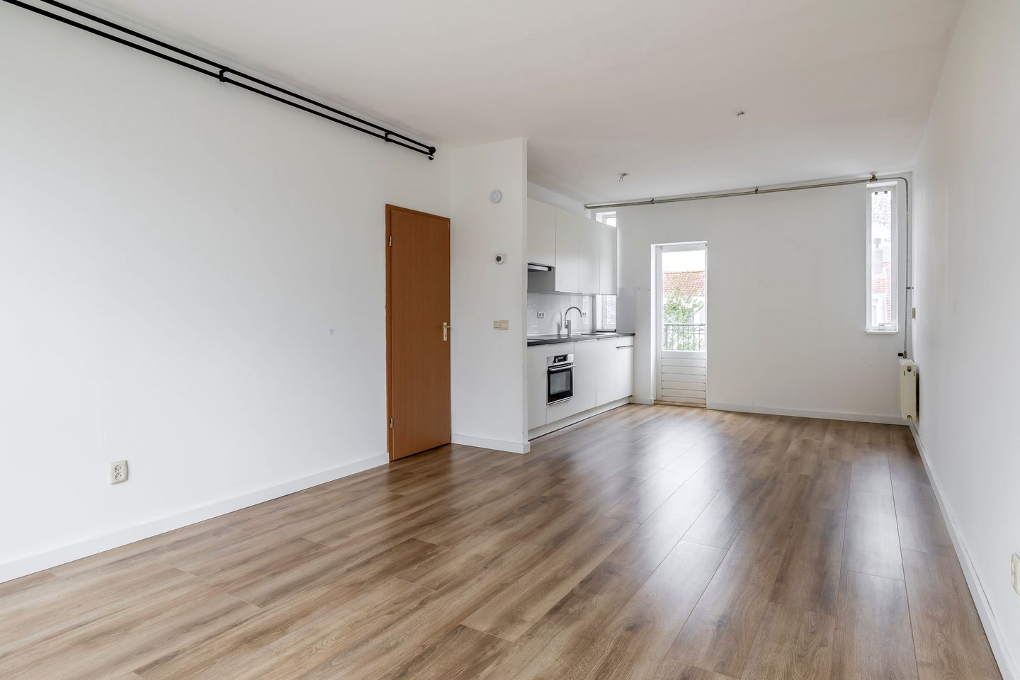 Aan de achterzijde ligt de keuken, met toegang tot het balkon. De keuken is functioneel ingericht en biedt ruimte voor een kleine eettafel of extra opbergkasten. Door de gunstige ligging komt ook hier veel licht naar binnen. Het balkon aan de achterzijde is een fijne plek voor een kop koffie in de ochtendzon.