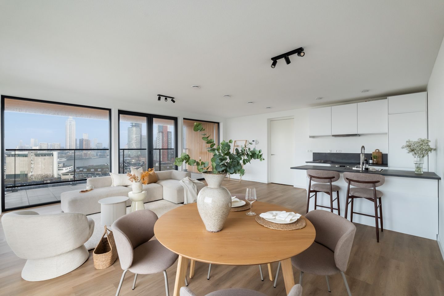 Living by the water in trendy Katendrecht, in complex The Havenkwartier! High-rise living with river view and Rotterdam’s dynamic port city. This comfortable apartment on the 14th floor at Maashaven N.Z. 835 offers the best of both worlds. With the city centre within easy reach by car, public transport, bicycle or the typical Rotterdam water taxi, you can enjoy all the amenities the city has to offer. Combined with privacy, abundant natural light and tranquillity thanks to its high position, this apartment provides a truly pleasant living environment. The property features two bedrooms, a private parking space and is part of a modern residential complex in a central location on Katendrecht — a neighbourhood that has grown into one of Rotterdam’s most popular and characterful districts in recent years. Katendrecht: where history meets modern living Katendrecht has a rich history as a former harbour island where dock workers, sailors and migrants lived side by side. Thanks to its location along the River Maas, it developed into an important port area with a raw, international character. Following extensive developments, Katendrecht is now a vibrant and characterful urban neighbourhood where history and modern city living come together, with restaurants and cultural venues within walking distance and a surprisingly central location. Ground floor Via the well-maintained entrance on the waterfront, you reach the apartment on the 14th floor by elevator. The complex also features two shared rooftop gardens and a communal bicycle storage. Apartment layout – 14th floor Upon entering the apartment on the 14th floor, you step into the hallway, which is equipped with an intercom system and provides access to all rooms. On the right-hand side of the hallway are the two full-sized bedrooms, both with large windows offering views of the River Maas. On the left-hand side, you first access the spacious bathroom, fitted with a separate bathtub, a luxurious walk-in shower and a double washbasin. Continuing along the hallway, you reach the L-shaped internal storage room, which houses the ventilation system and washing machine connection. Before entering the living room, there is also a separate toilet with a washbasin. From the hallway, you step into the light-filled living room, which is equipped with both underfloor heating and cooling, ensuring optimal comfort throughout all seasons. What immediately stands out is the impressive view over the Nieuwe Maas. The nearly 40 m² living room offers luxury and comfort and provides access to the covered balcony of over 15 m² — the perfect place to enjoy the evening sun while watching the interplay between the vibrant city and the movement on the water. The open kitchen connects seamlessly to the living room and is fully equipped, allowing you to make full use of your culinary skills during cosy family evenings. The kitchen includes a refrigerator with separate freezer, dishwasher, induction hob with extractor hood, and a combination oven/microwave. Living on the 14th floor in The Havenkwartier means breathtaking views, luxury, and the ideal balance between peace and urban life, thanks to excellent connections to the city centre. Parking A major advantage is the private parking space, which is mandatory and offered separately for €40,000. Contact us to schedule a viewing and experience it for yourself. Key features: - Year of construction: 2023 - Full ownership - Energy label: A++ - Located on the 14th floor - Living area: 100 m² (in accordance with NEN 2580) - Underfloor heating and cooling - Homeowners’ association contribution: €248,12 per month - 1 parking space in the garage (€40,000) - 2 shared rooftop gardens - Communal bicycle storage - Delivery in consultation (possible at short notice) No rights can be derived from the information, text and photos of this property.
