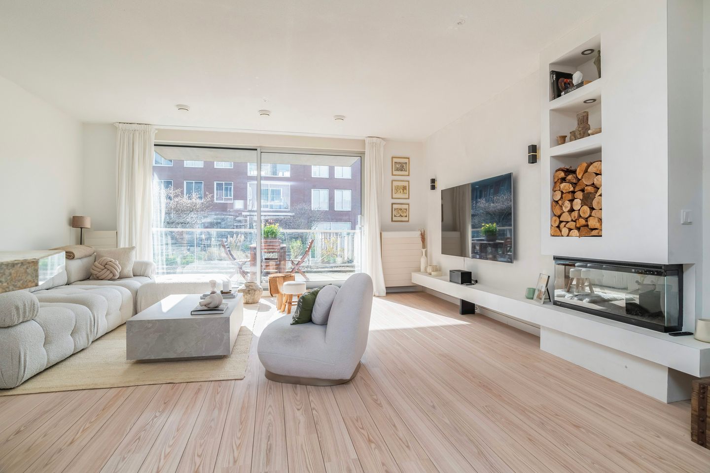 Upon entering on the first floor, you immediately notice how much natural light comes in. The large windows in all rooms create an open and spacious feeling. The living room is the heart of the home and the perfect place to come together. The media wall adds extra atmosphere and character, while the open kitchen with a beautiful granite countertop and peninsula connects seamlessly to it. Through the sliding doors, you step straight onto the sunny, generous terrace. This lovely outdoor space borders the communal courtyard garden and offers a green and peaceful experience in the middle of the city.