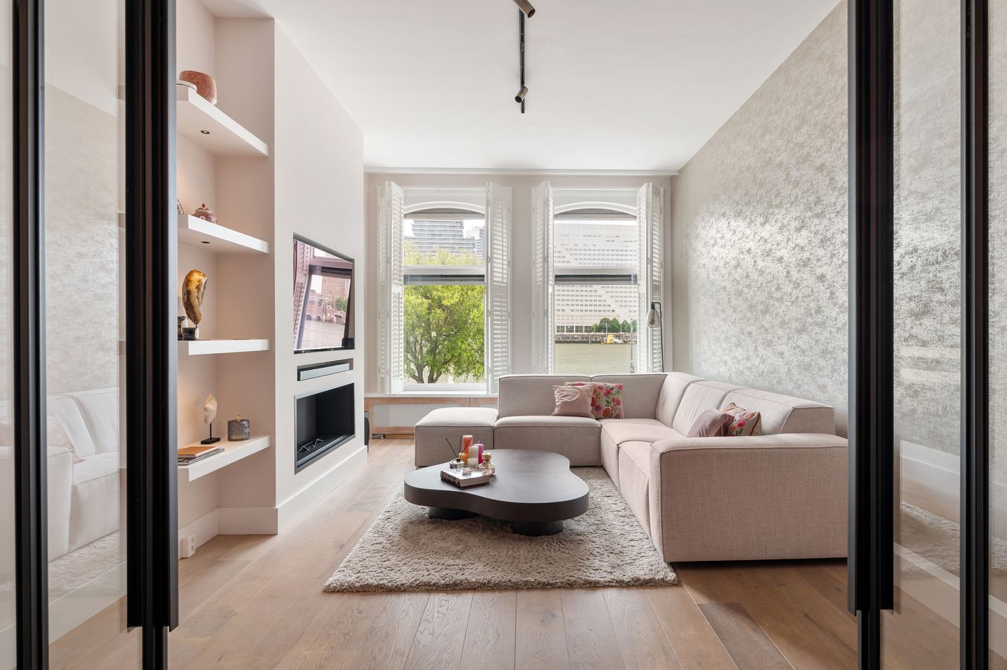 Set in an elegant façade on the Maaskade, right on the water and overlooking the vibrant heart of Rotterdam, you'll find this stylish, boutique-style renovated ground-floor apartment with a sunny private terrace facing south. Every detail has been carefully considered. Luxurious materials, soaring ceilings, historical charm and breathtaking views come together effortlessly.