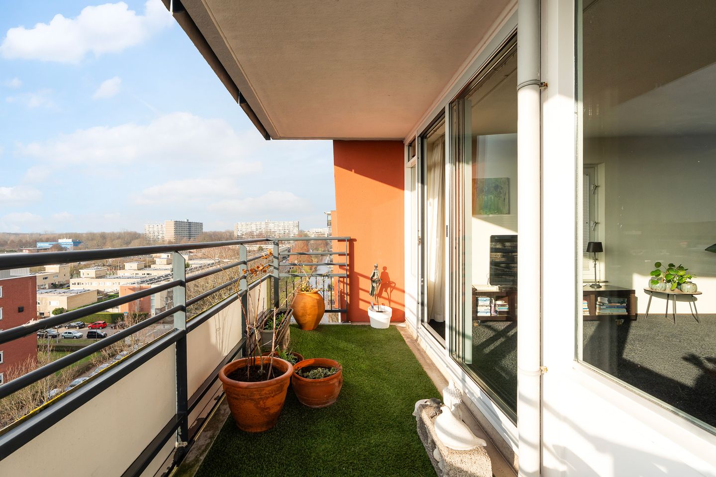Het balkon is een fijne verlenging van de woonkamer. Hier geniet je van de buitenlucht en het vrije uitzicht, een heerlijke plek voor je eerste koffie of een borrel in de avondzon.
