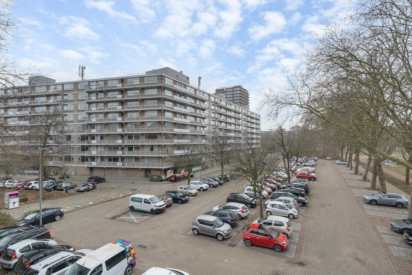 Voor het complex ligt een ruim opgezet parkeerterrein, ideaal voor uzelf en uw bezoek. Aan de achterzijde bevindt zich de collectieve, groene binnentuin – een rustige plek voor een wandeling of een moment van rust. De wijk biedt volop ruimte, licht en groen.