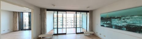 Royale living aan de achterzijde (circa 4.97 x 4.74 m) met aangrenzende loggia van circa 8,5 m2. De loggia beschikt over een dubbel te openen schuifpui met balkonhek.