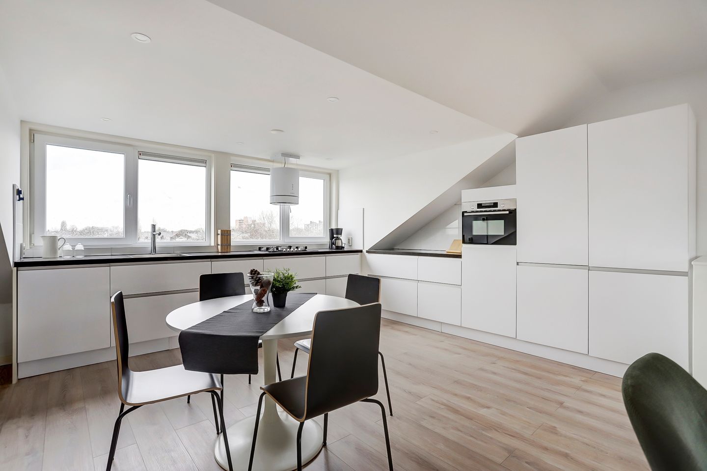 Op de vierde verdieping word je verwelkomd in een ruime en lichte woonkamer met een moderne open keuken. Dankzij de dakkapellen heeft deze etage niet alleen veel natuurlijk lichtinval, maar ook extra comfort en sfeer. Dit is dé plek om te ontspannen, te koken en gezellig samen te zijn.