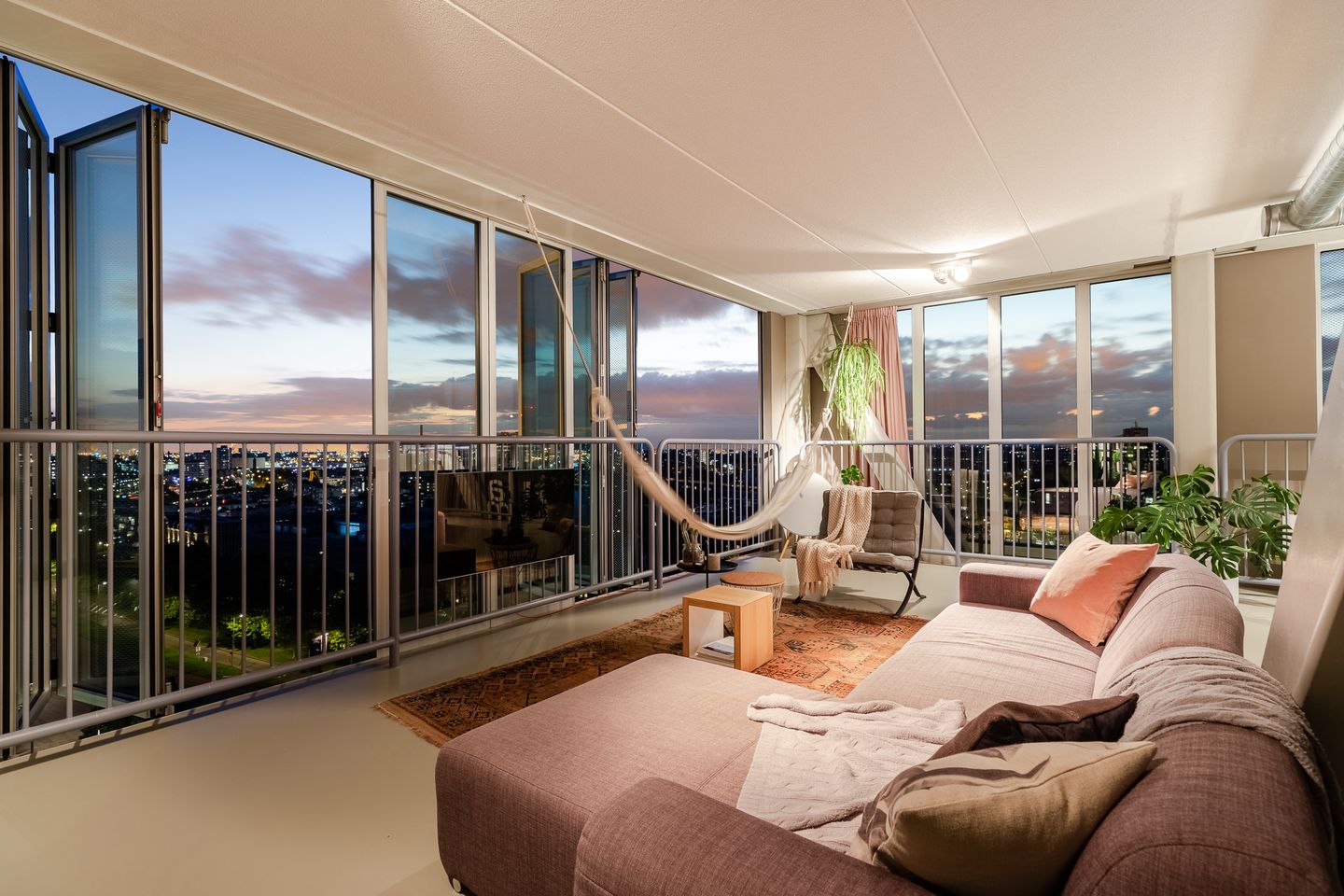 Dankzij de hoekligging en de grote raampartijen op de dertiende etage heb je een adembenemend panorama over de Maas, de havens en de skyline van Rotterdam. De glazen pui met harmonicadeuren laat je optimaal genieten van het buitengevoel, of het nu middagzon of avondgloed is.
